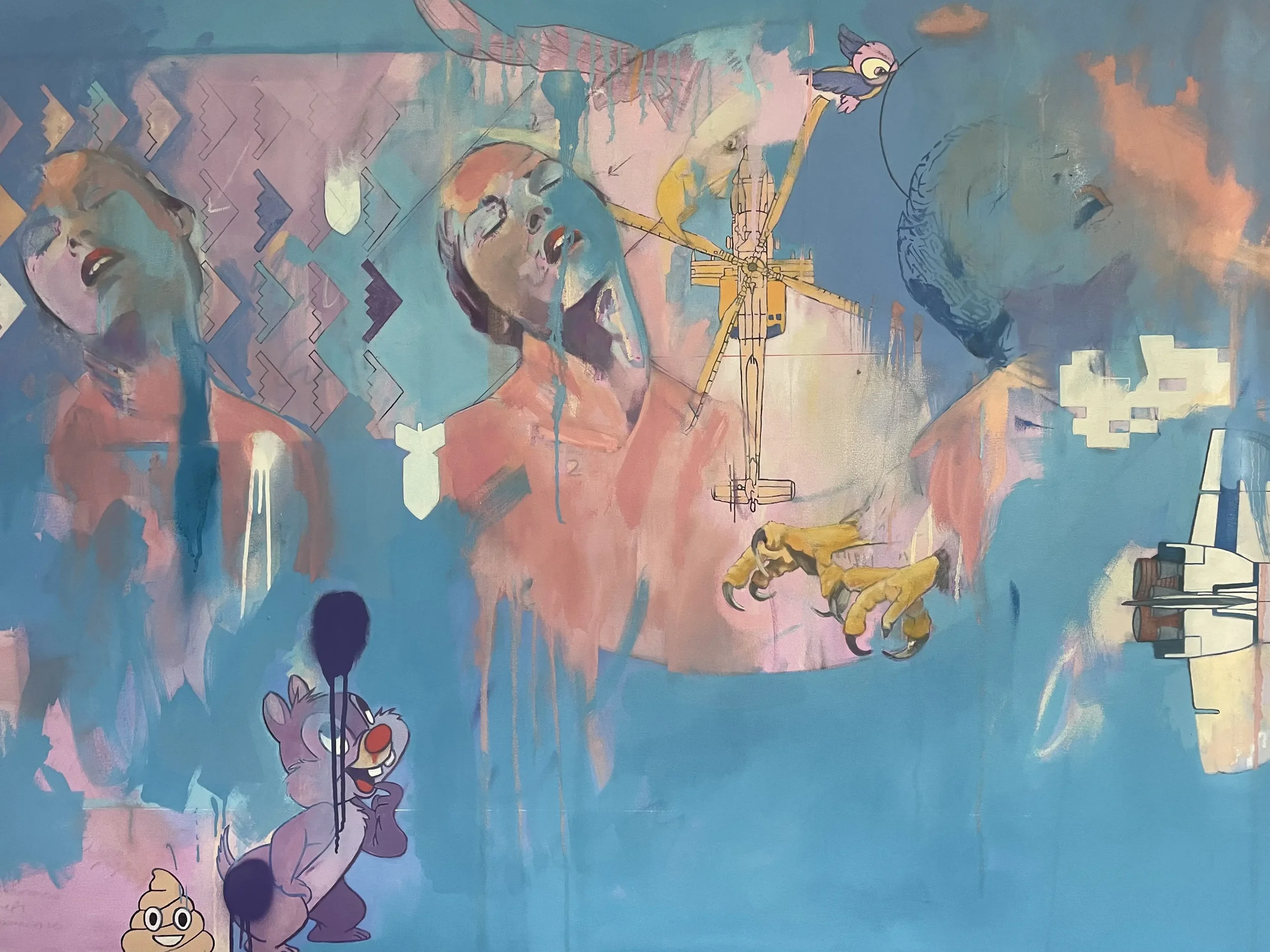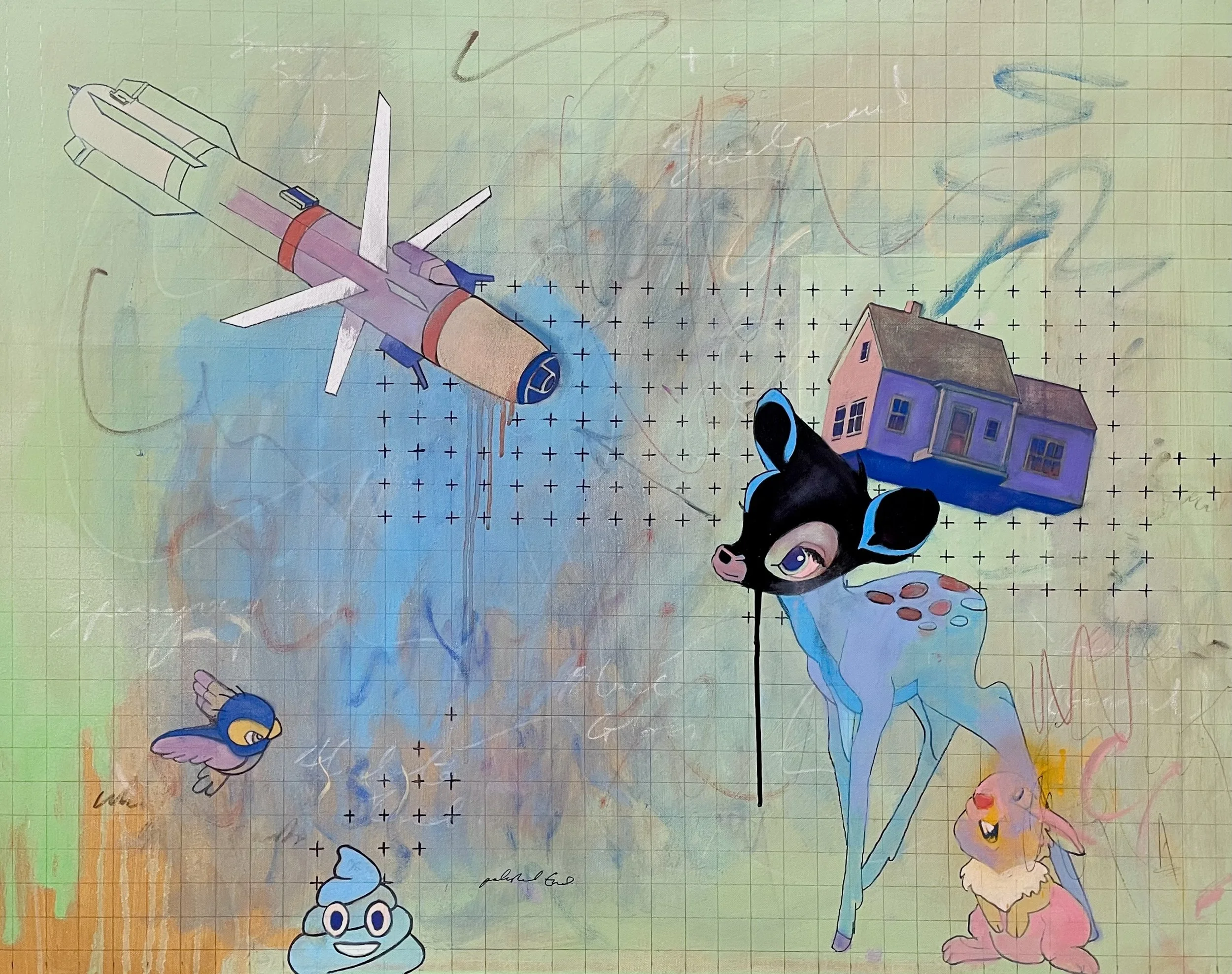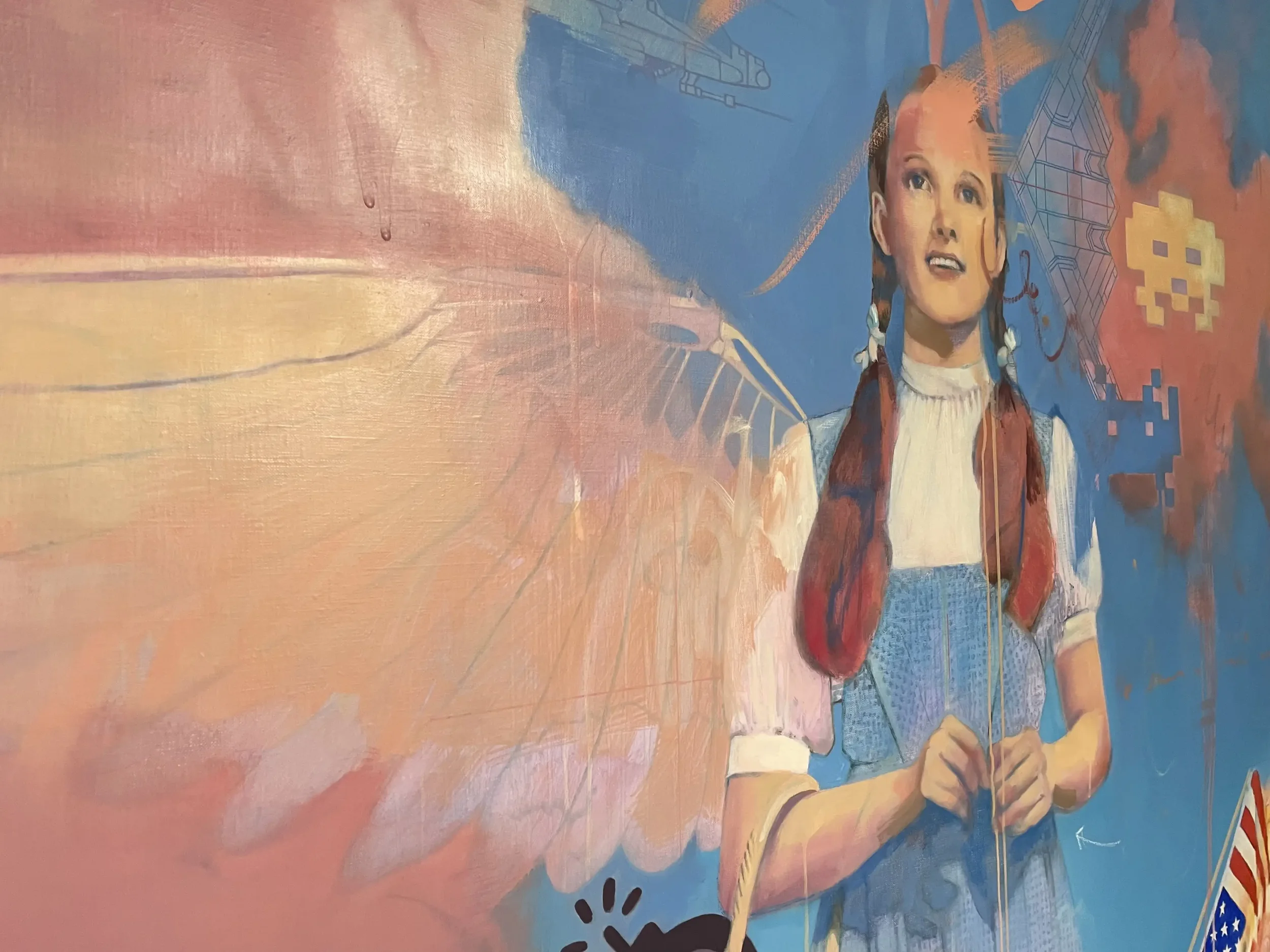 Dorothy, as winged angel, betrays the myth of America (Garland was ruined by Hollywood) surrounded by Hellfire missiles and Stealth bombers with a host of cartoon characters in mock celebration. Dollar signs drones and the Space Shuttle. A Bald Eagle swoops past sequences from ‘Psycho’, as an Apache flies upwards. Comedic iconography adds a satirical twist.