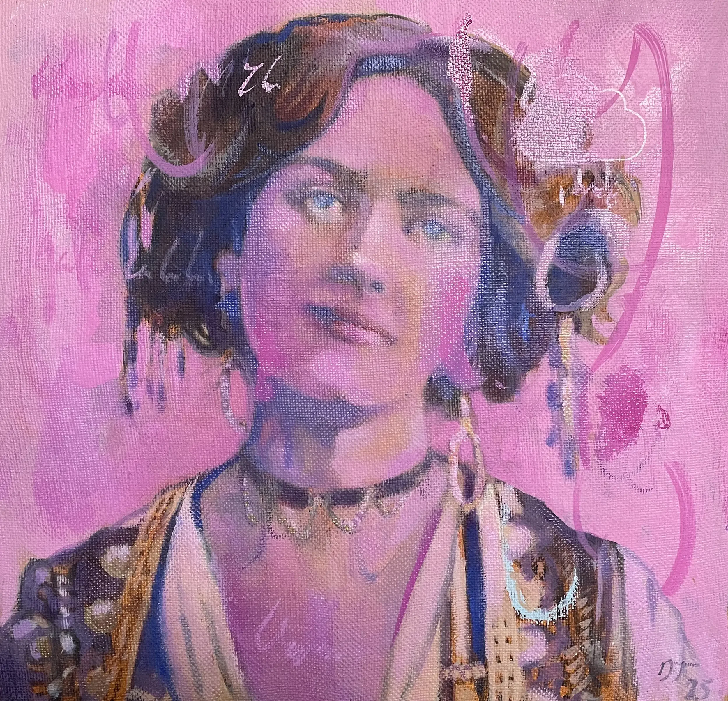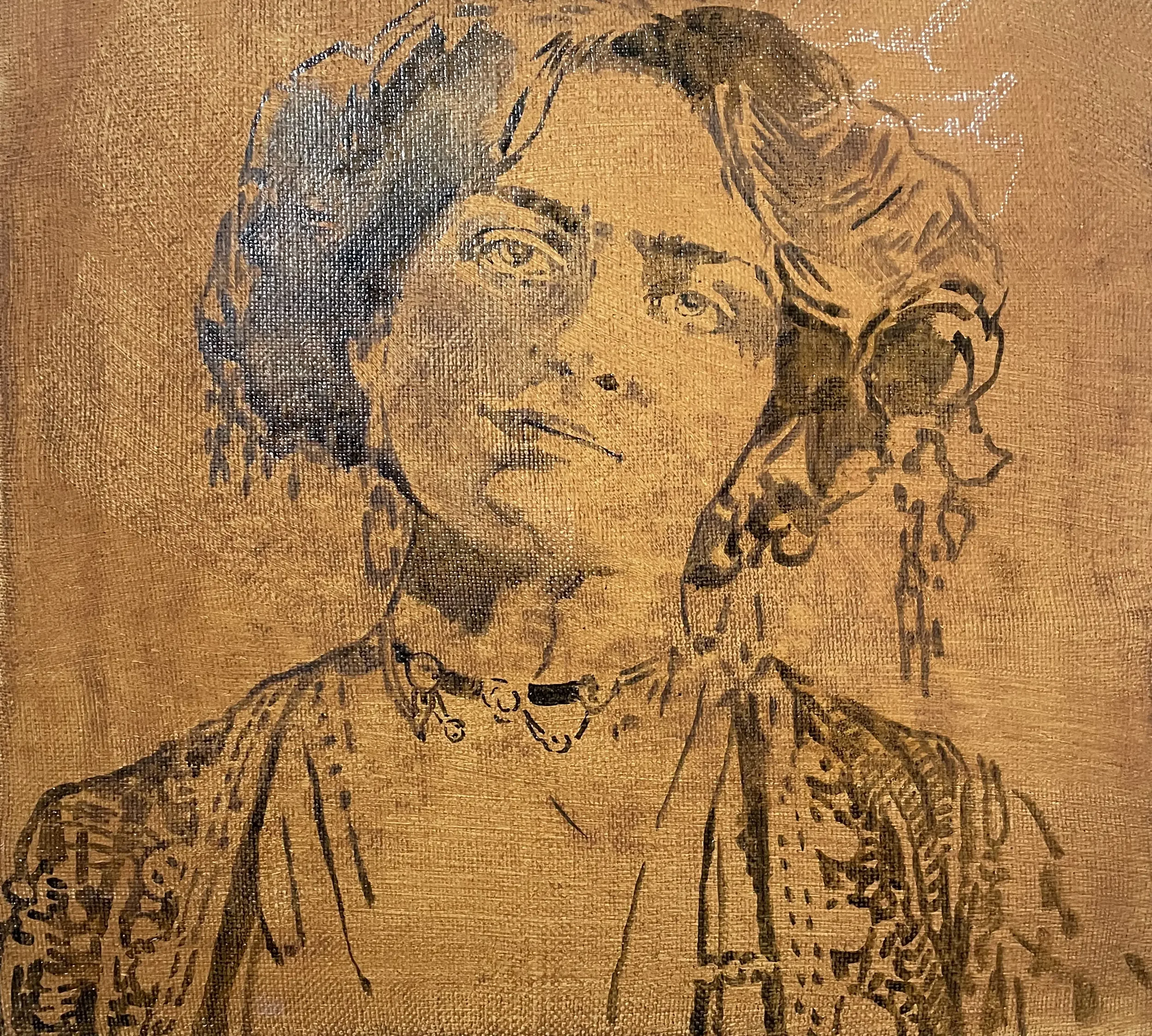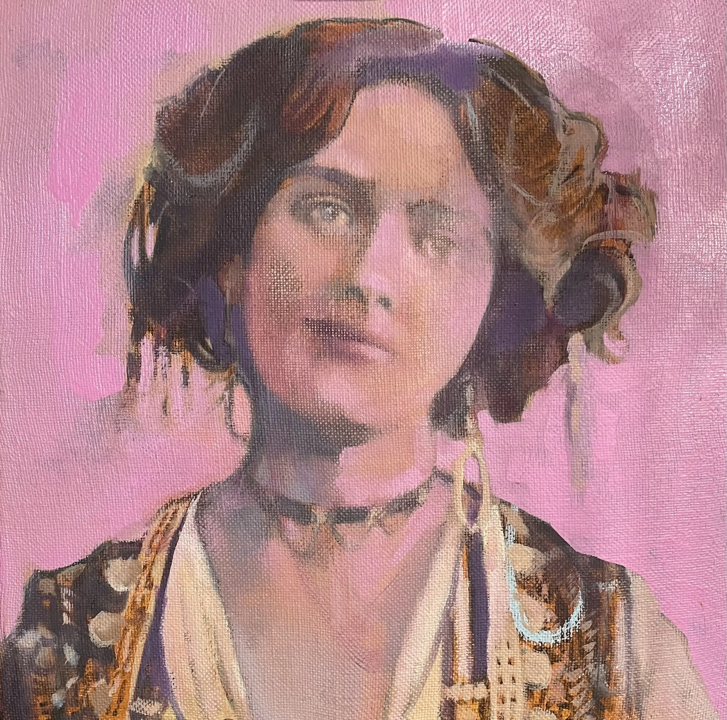 As this is only a small piece (40x40) and I was dealing with more substantial works that had more urgency, I was able to go back and forth at leisure, shaping, crafting and refining. For me, it’s also important to keep some of the base layer I started with, not to apply the paint too thickly. This allows the work to have depth, a slight theatrical sense of fore, middle and background. The hair and parts of the dress retain the original Umber.