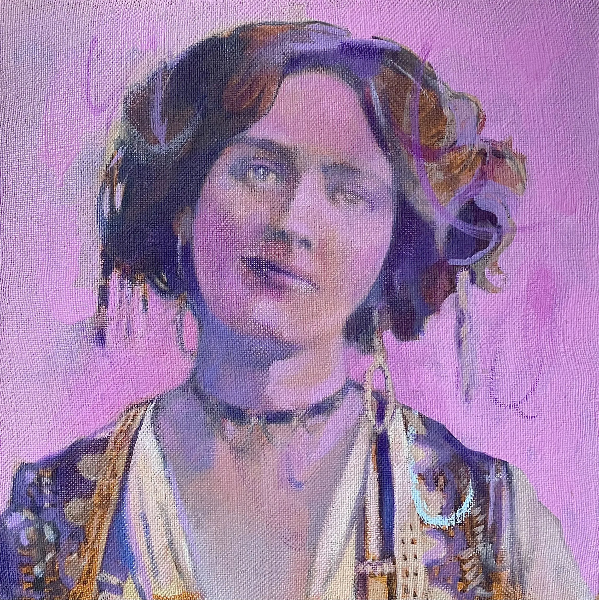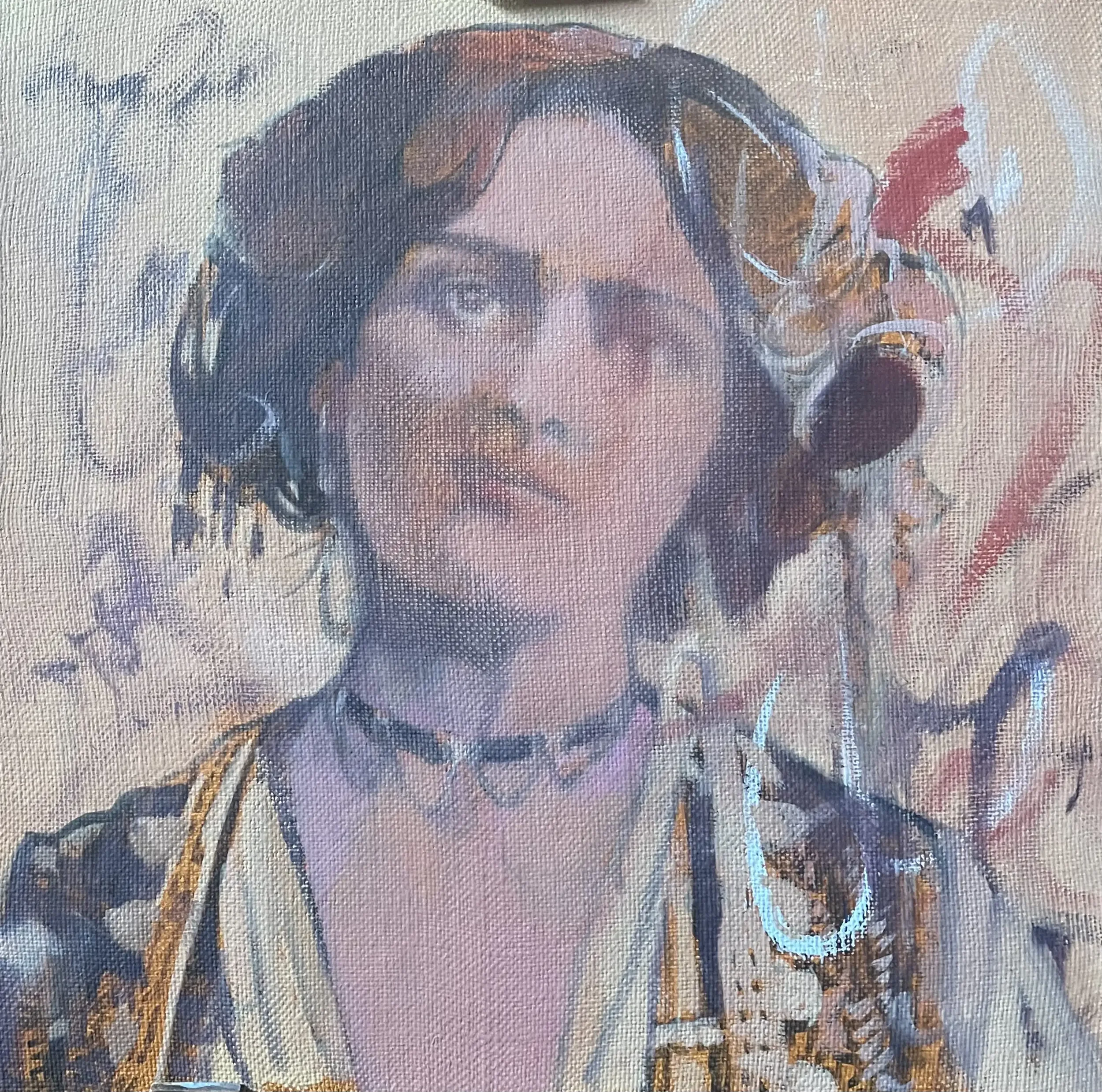 I’ve been using a lovely range of violets, magenta and fuchsias previously so it made sense to bring in this colour palette - again, associated with religiosity, penitence and poignancy, all in keeping with my Carte Vista series. You can see I start to tighten up areas, previous marks have disappeared under paint layers and I’ve started to form her head and eye structures, but very tentatively.