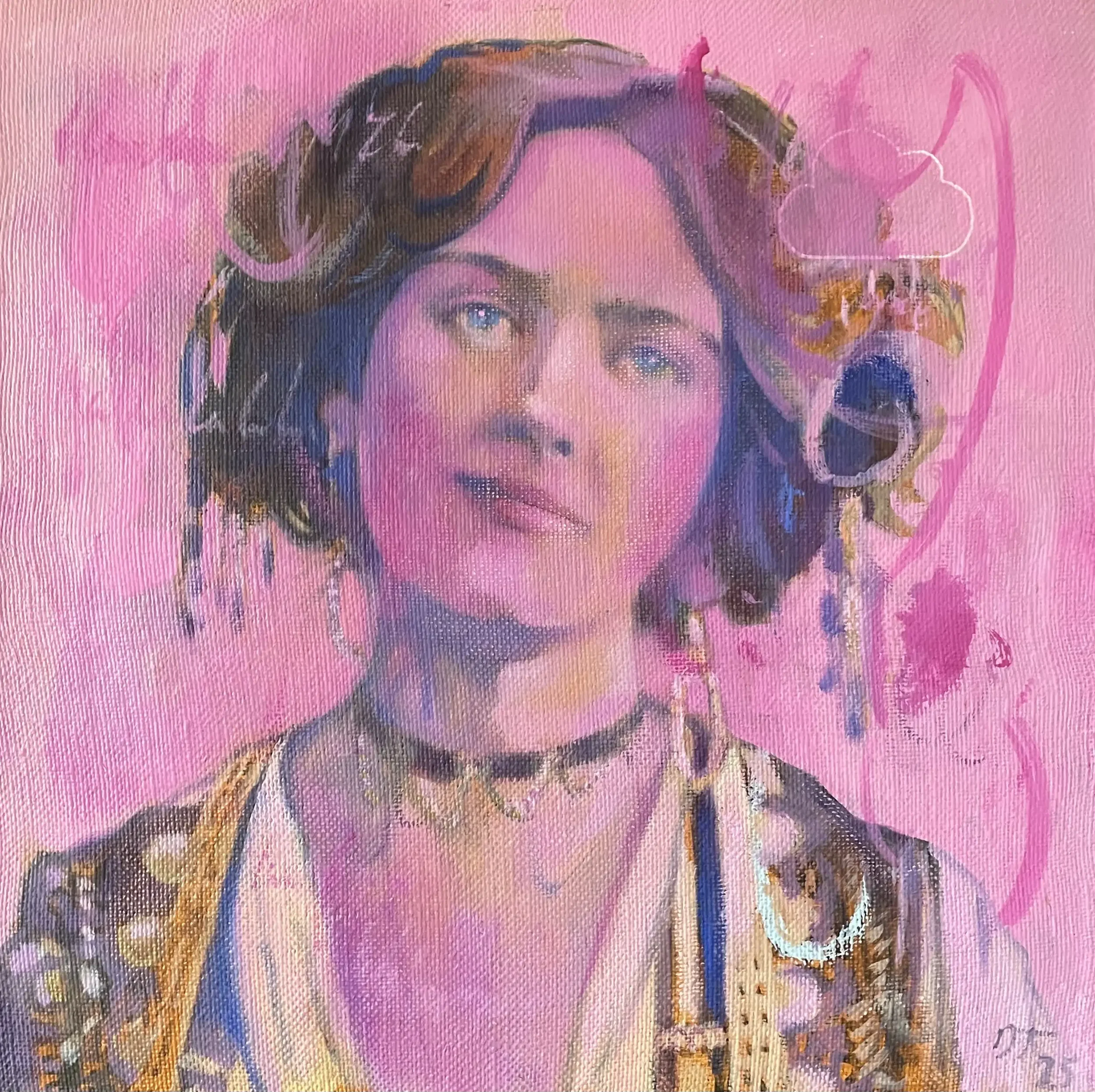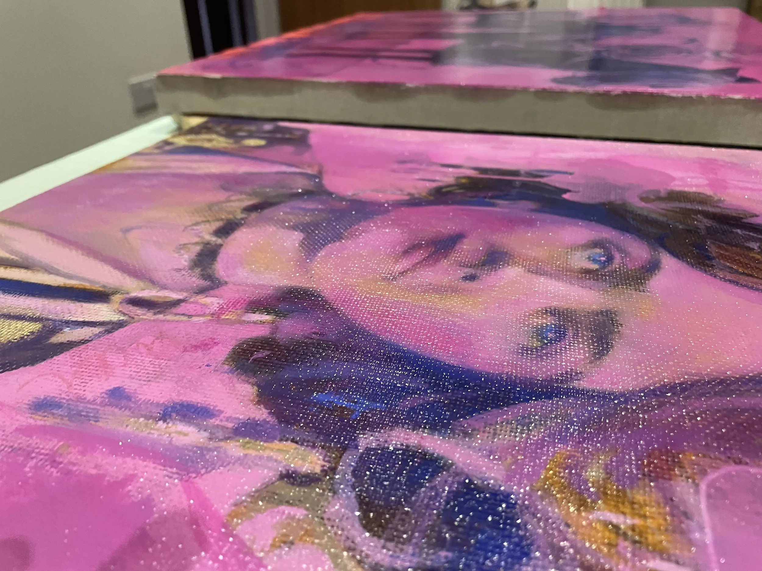 Happy enough with the dreaminess of the eyes and the basic knowing smile of the mouth, I applied a cloud stencil of pink spray paint that had just arrived. It accidentally dripped but I’m quite fond of the touch of serendipity. The last thing was adding gold leaf (I’ve had the same load since I worked in Manhattan as a textile designer in the mid 90s!) to her dress. I think it works.