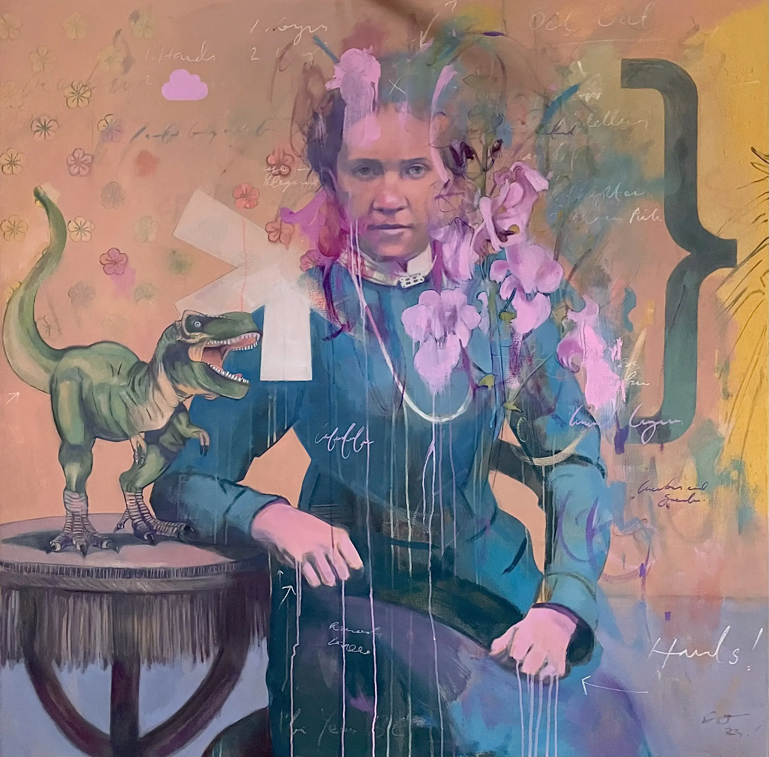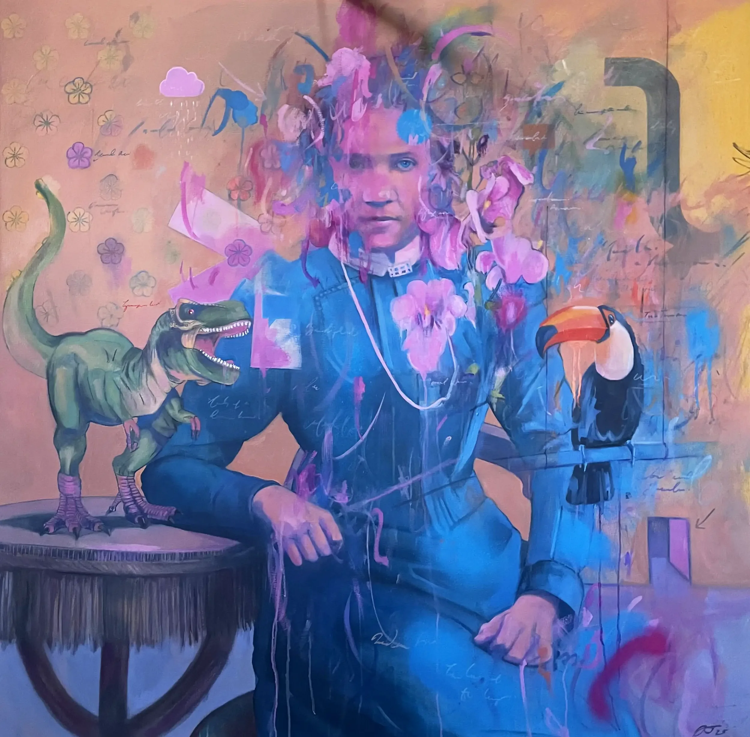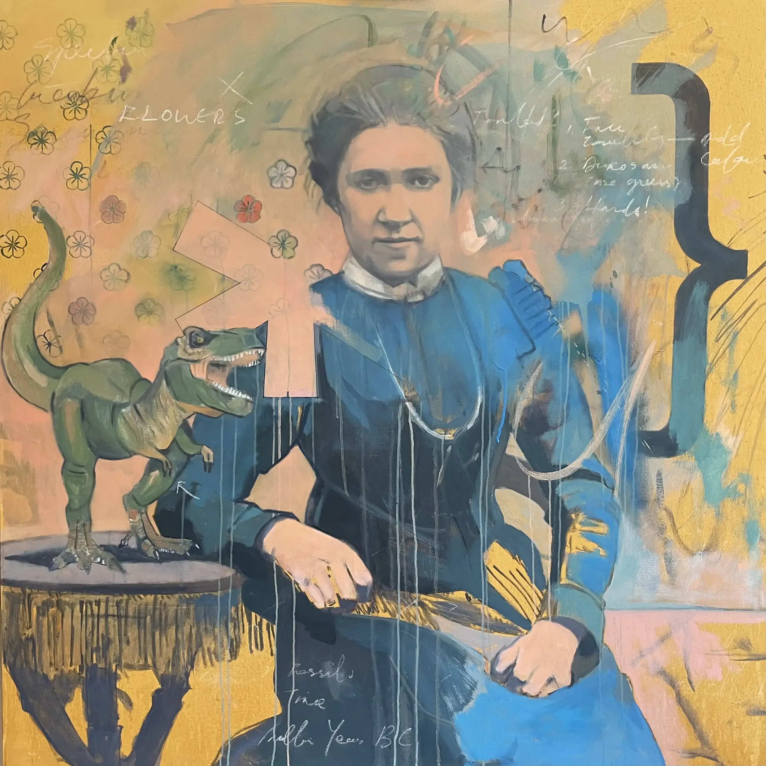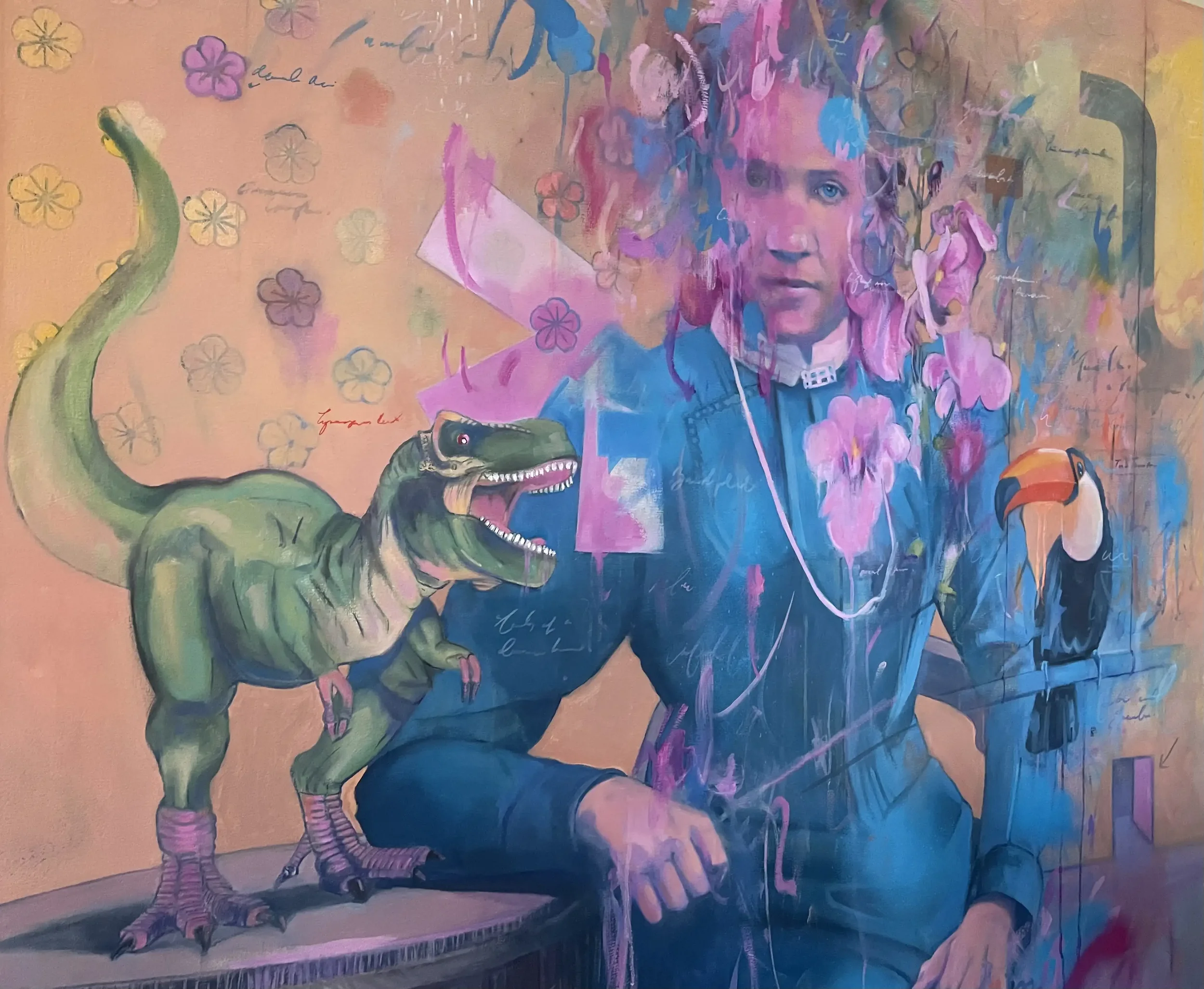 Having stretched, sized and primed the canvas, I added a base layer of yellow ochre and began the initial drawing in mid February 2023. I tentatively blocked in some colour, graphical shapes, florals and marks in July and August. I added in the T-Rex before going into a soporific slump with it.