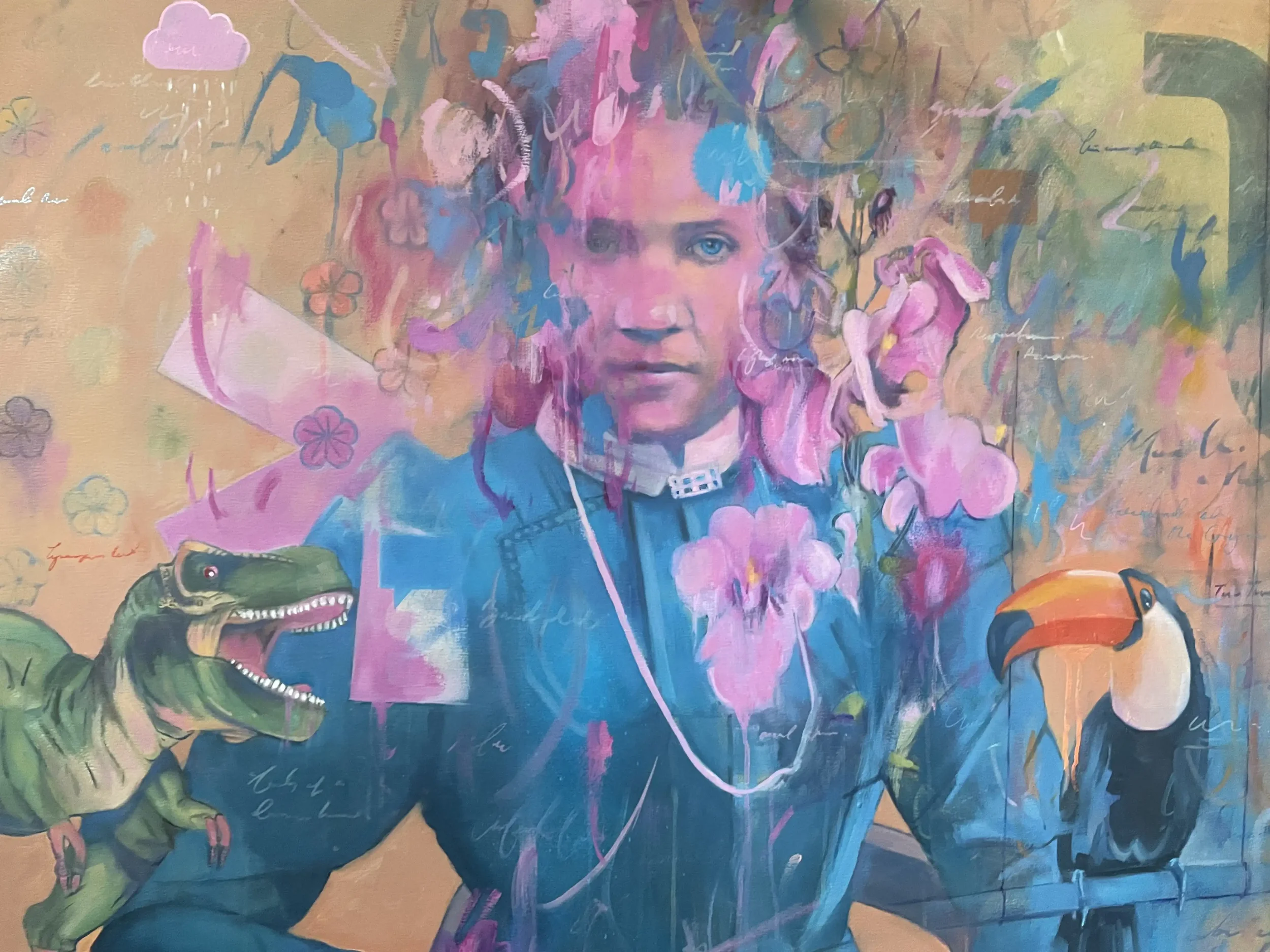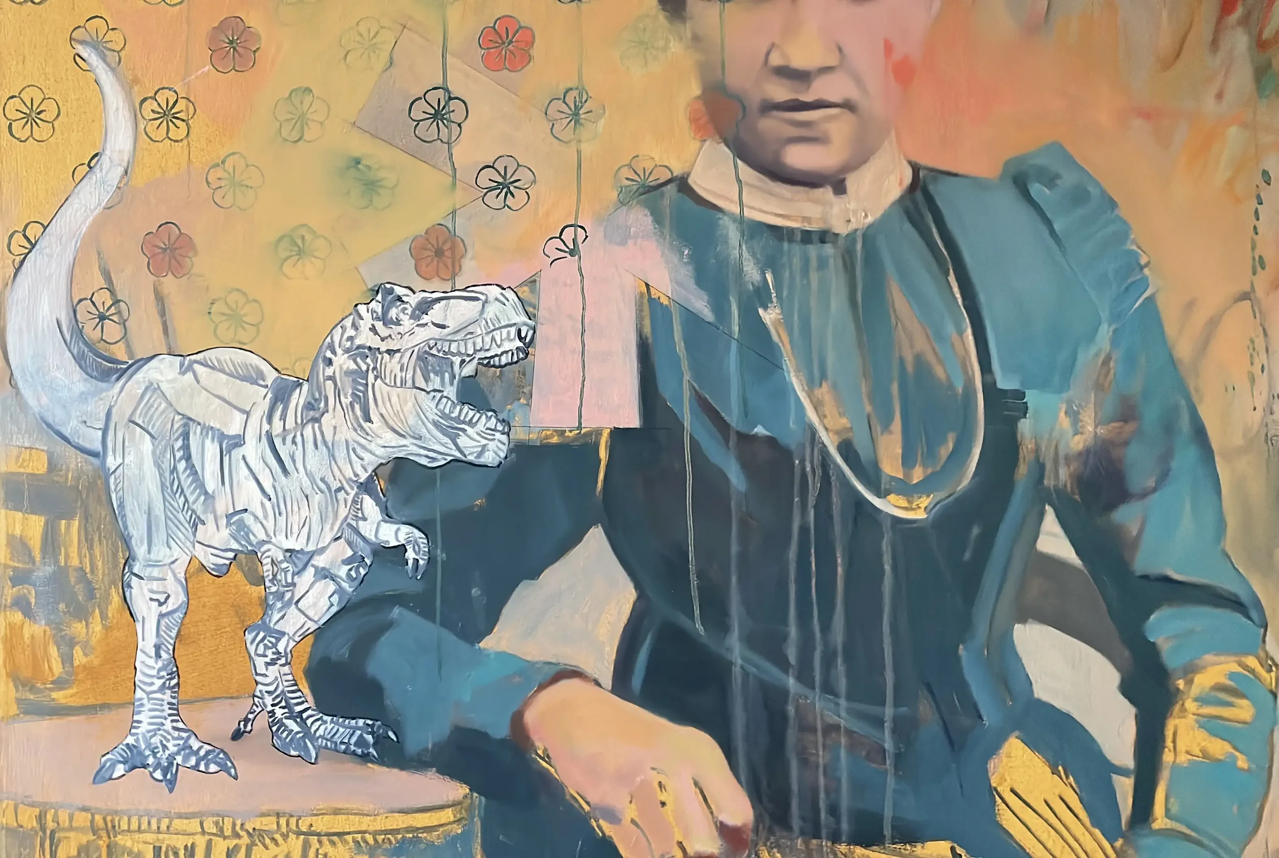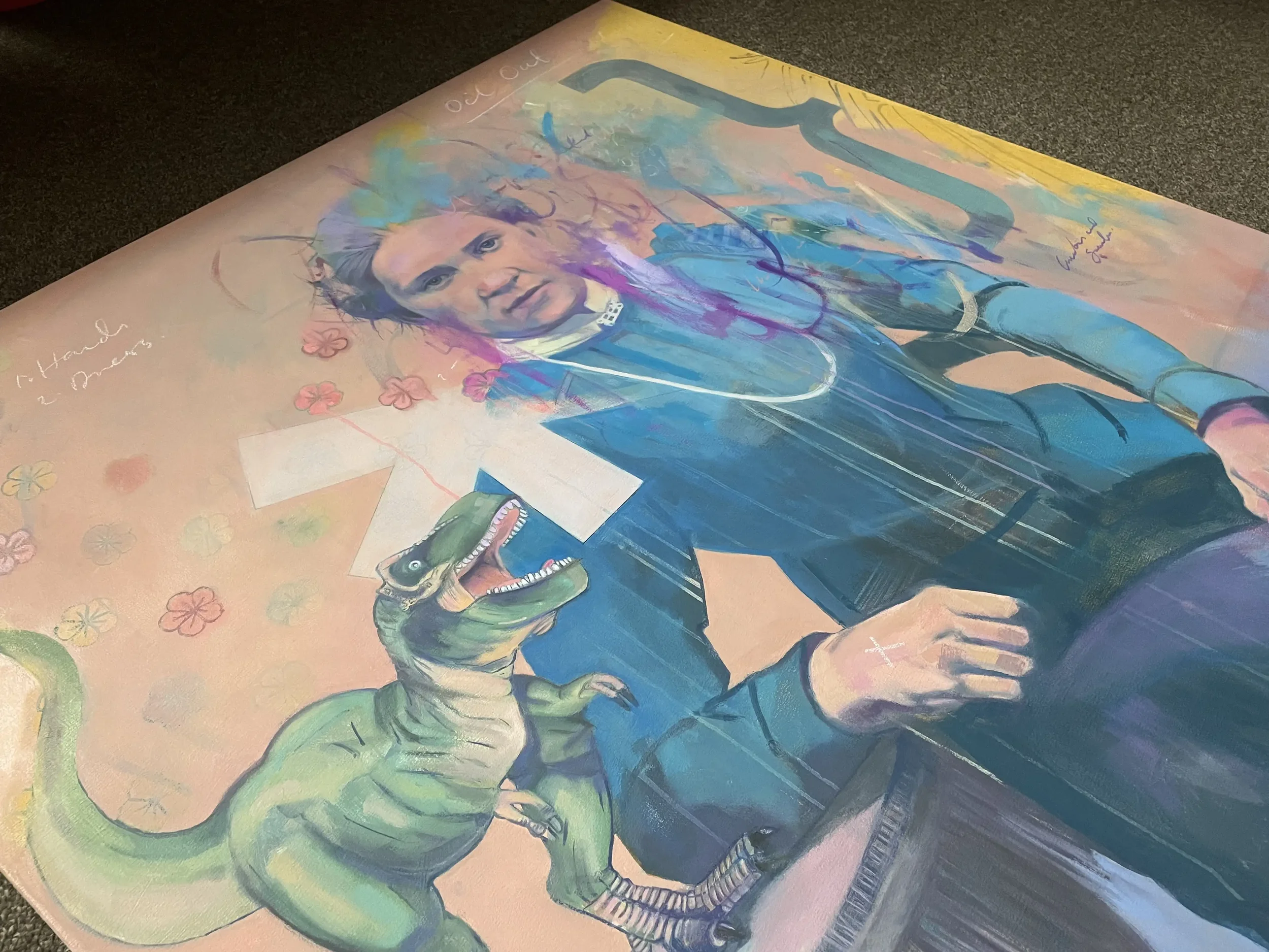 Having stretched, sized and primed the canvas, I added a base layer of yellow ochre and began the initial drawing in mid February 2023. I tentatively blocked in some colour, graphical shapes, florals and marks in July and August. I added in the T-Rex before going into a soporific slump with it.