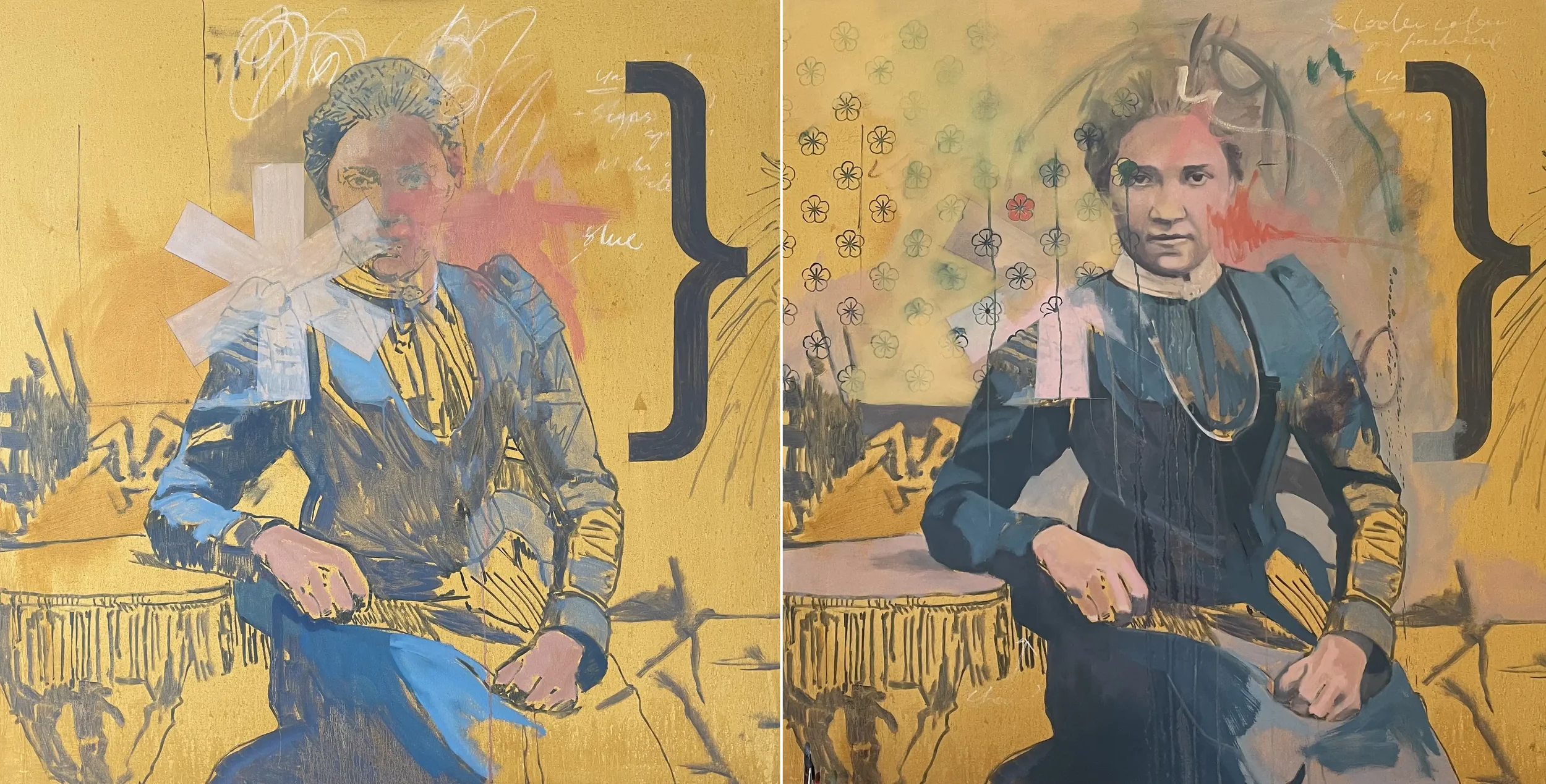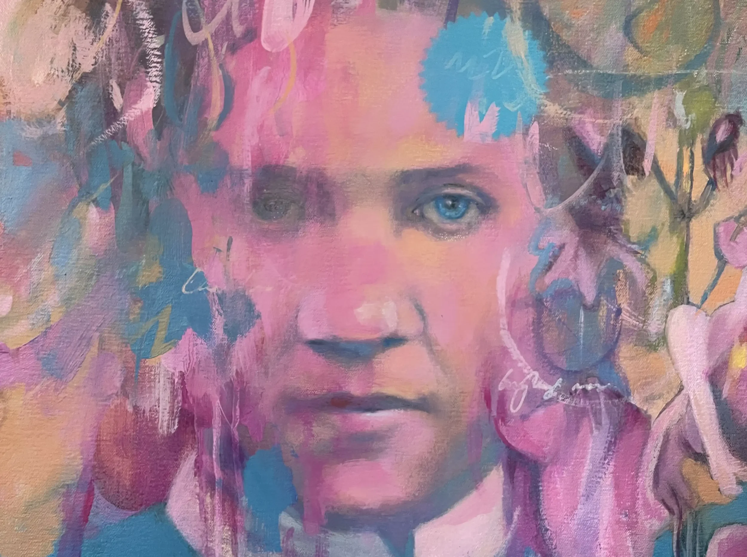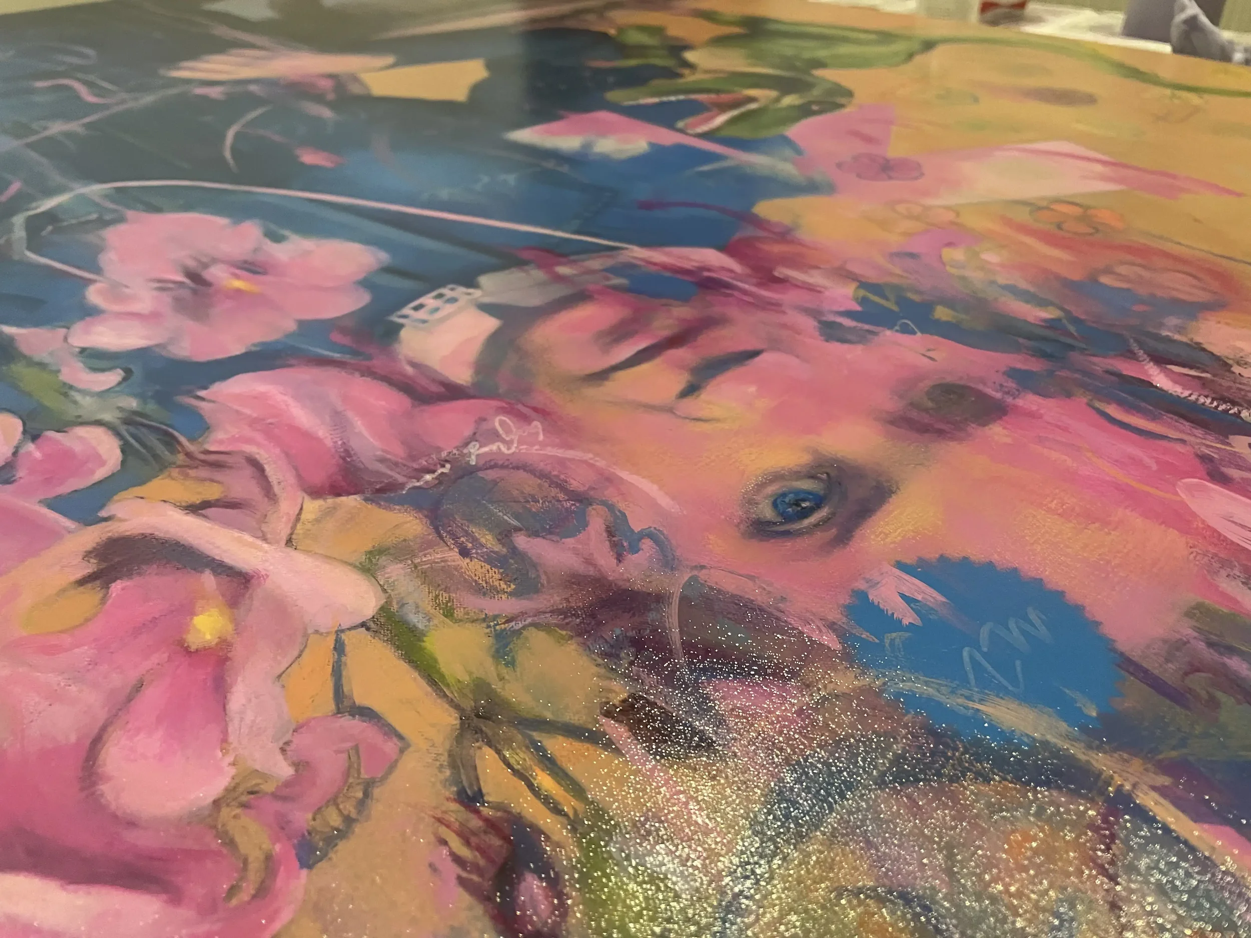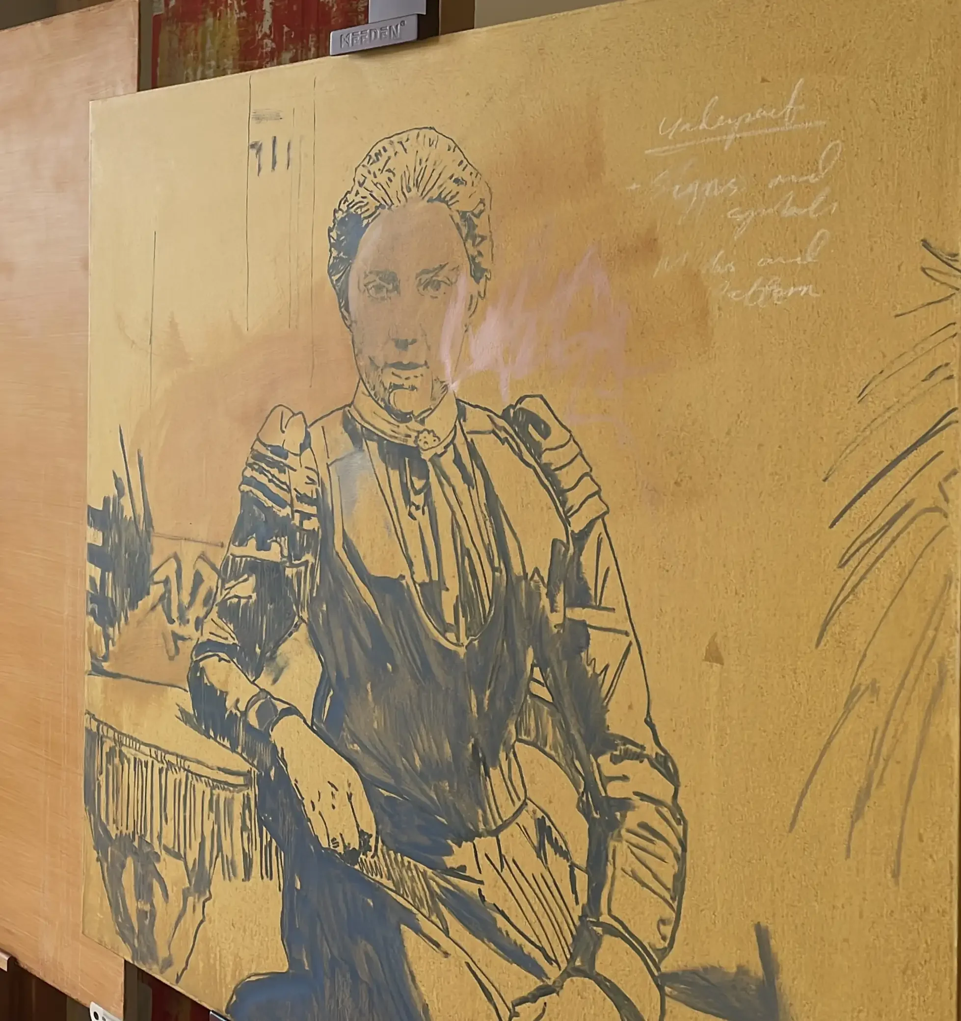 Having stretched, sized and primed the canvas, I added a base layer of yellow ochre and began the initial drawing in mid February 2023. I tentatively blocked in some colour, graphical shapes, florals and marks in July and August. I added in the T-Rex before going into a soporific slump with it.