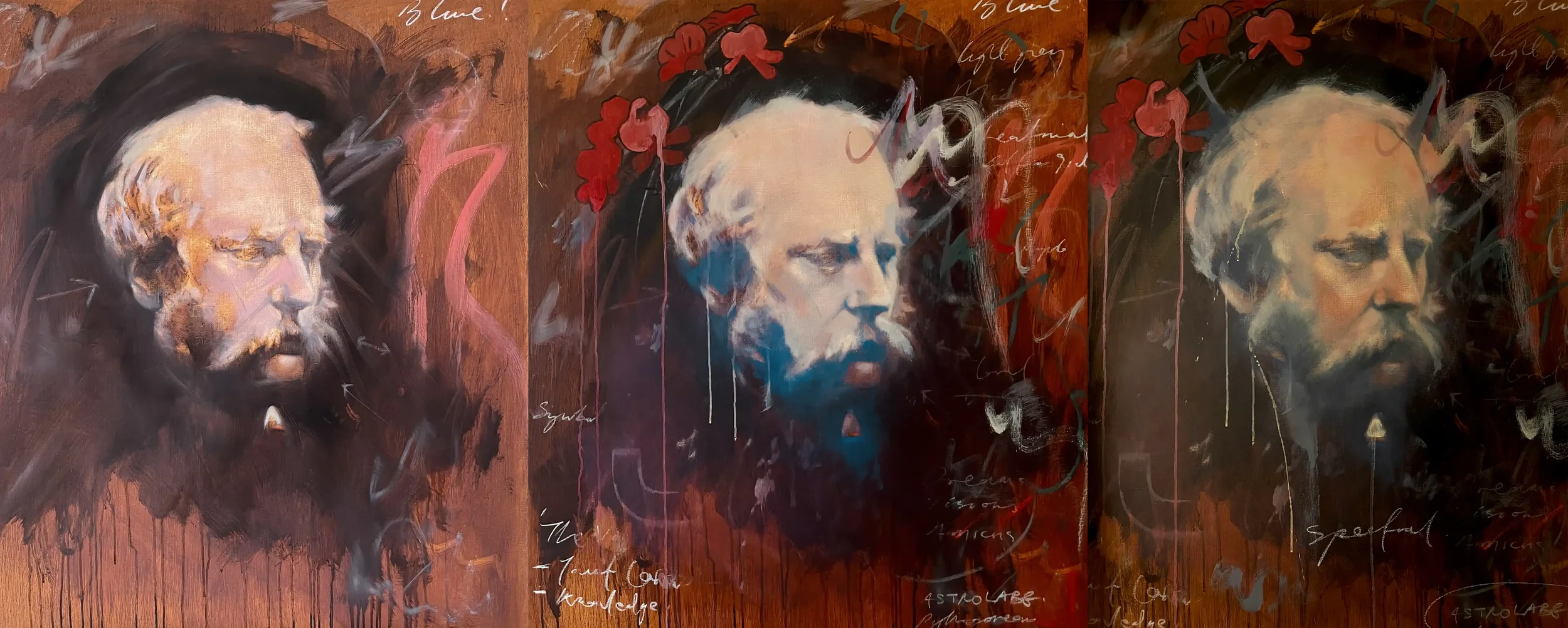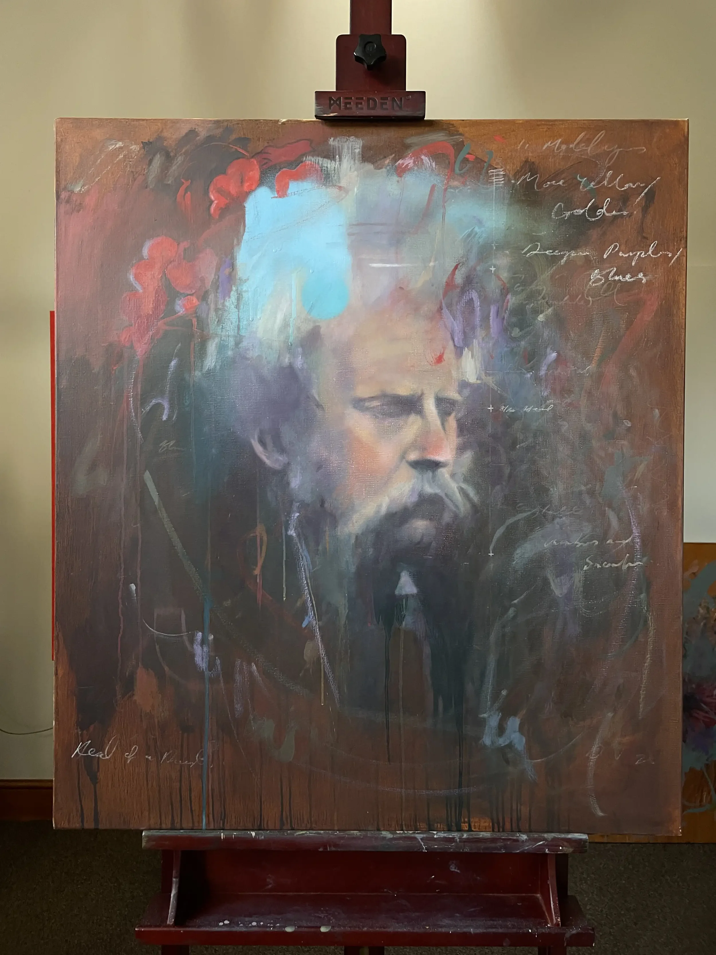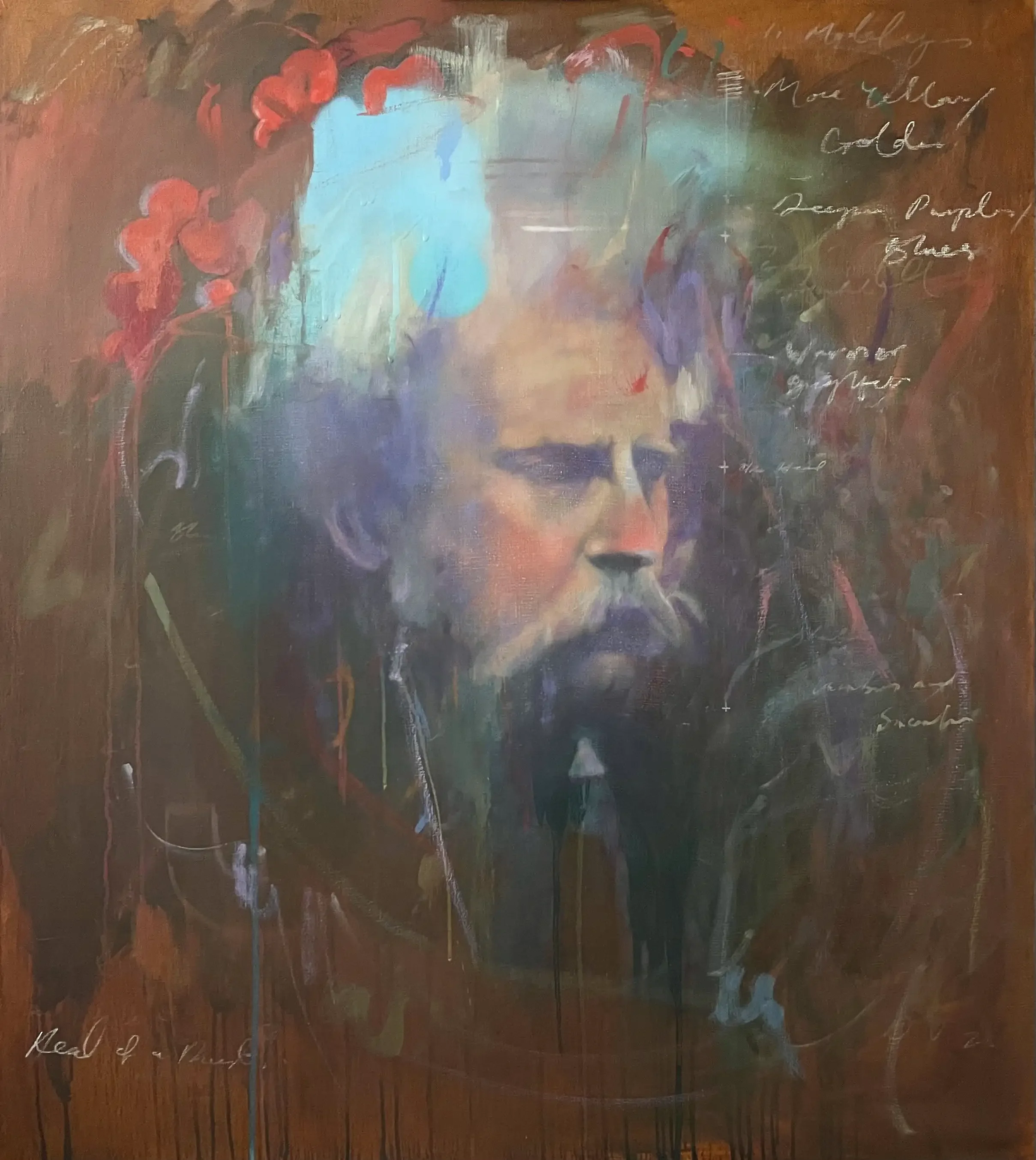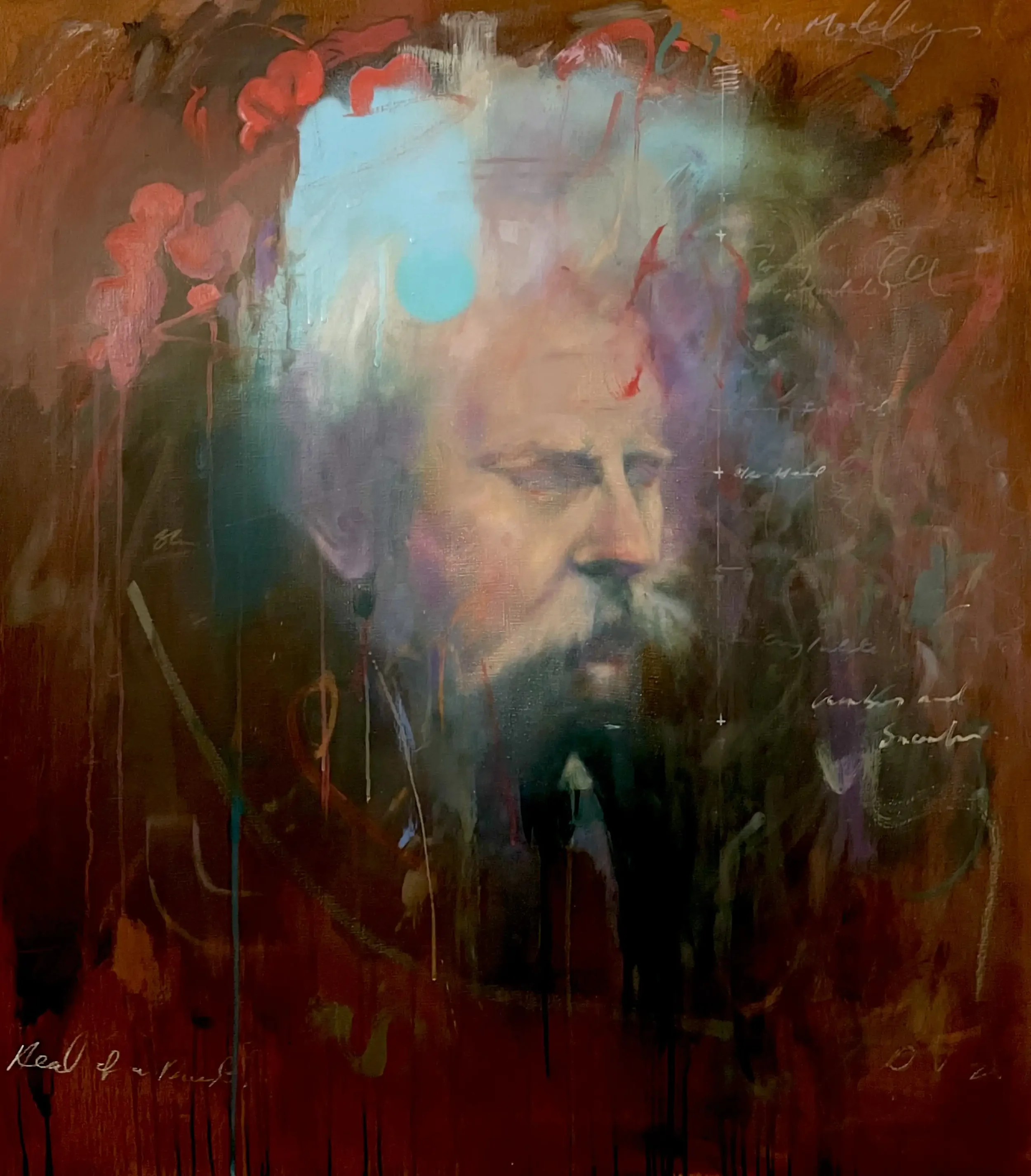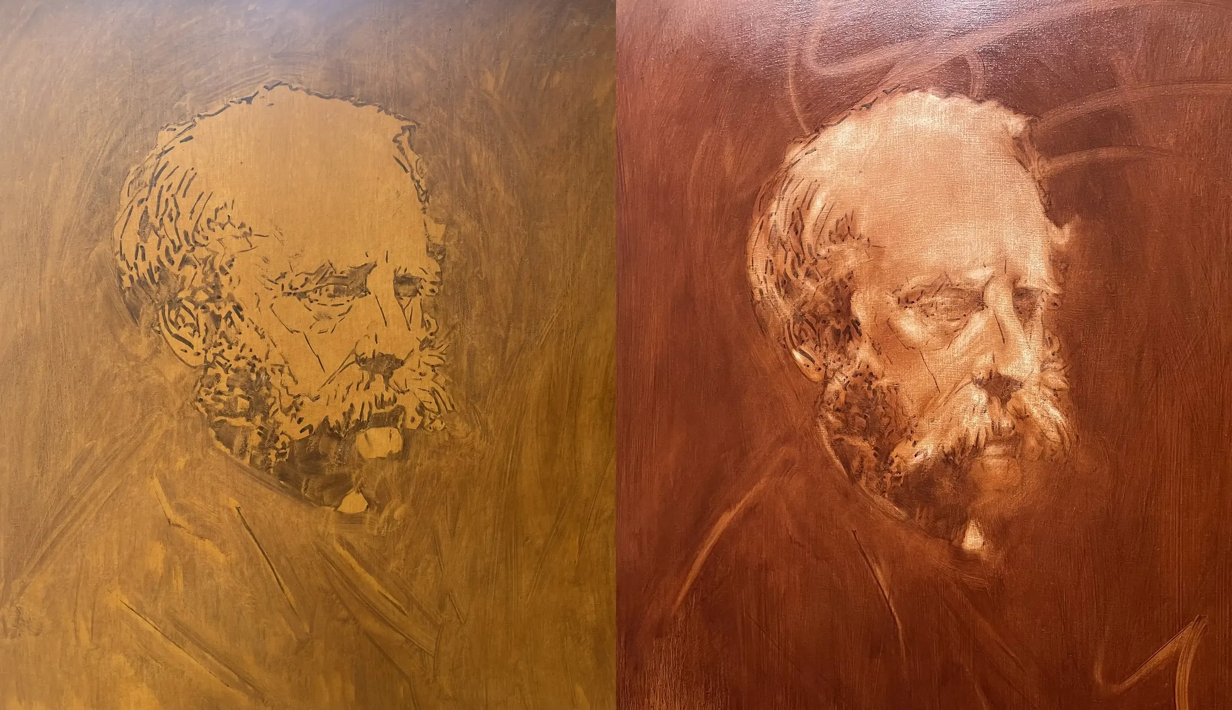 Having prepped the 76 x 86cm canvas in April 23, I started with some earth colours as a base layer before drawing the head. After a darker umber ‘scumble’ was applied, I worked a rag into the surface, removing areas of mid and light tones.